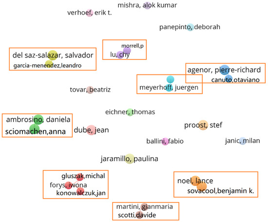 Co-authorship analysis aims to analyze the authors and their institutional affiliations, obtaining a deep understanding of the social structure and collaboration networks among the main scholars, research institutions, and countries [38,39]. Identifying scientific collaboration networks in a research domain could facilitate access to specialties and expertise, and help publishers to assemble editorial teams, reducing the research isolation.