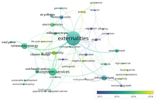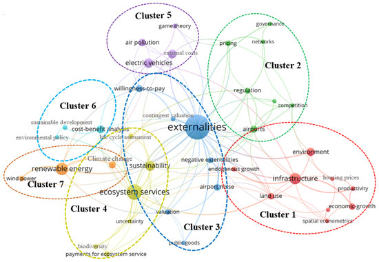 In combination with Figure 5 and Table 4, the following clusters of keywords represent the mainstream research domains in infrastructure externalities: (1) Cluster 1, which is the largest cluster, mainly focused on relationships among infrastructure, economic-growth, and environment. Spatial economics and growth theory (endogenous growth) are commonly used methods. (2) Cluster 2 and cluster 3, which account for a large share of the network, focused on airport-related externality issues. Regulation and pricing are commonly used governance methods for airport competition. Willingness-to-pay and contingent valuation are commonly used methods for evaluating the negative externalities of airport noise to the health of the people and creatures near the airport. (3) Cluster 5 focused on external costs of road transport such as air pollution, congestion, and noise. According to the node sizes, the occurrence of these keywords was very high. (4) Cluster 4, cluster 6, and cluster 7 were closely located to each other, representing the strong relatedness among them. Cluster 4 focused on ecosystem services and payments for ecosystem services, dealing with externality-related issues of the green infrastructure system. In this research domain, there is a significant issue of uncertainty. Cluster 7 focused on externalities of energy systems. The importance of renewable energy, such as wind power and solar power, to mitigate climate change was emphasized. Environmental policy and decision making for sustainable development based on cost-benefit analysis and life cycle analysis were emphasized in cluster 6.