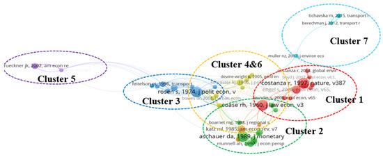Document co-citation analysis provides a network of co-cited references. Generally, the references highly cited in the selected articles provide the knowledge base of these articles [60] and were treated as concept symbols [61]. The clusters of co-cited references provide an insight into the structure of a scientific knowledge domain [25]. This study explored the underlying knowledge base of infrastructure externalities research through a co-citation analysis of cited references. By setting the minimum number of citations of a cited reference at 7, a network comprised of 56 nodes and 211 links was created and visualized by weights of citation, as shown in Figure 7. The 56 cited references were classified into 7 clusters. A node in this network represents a document that is denoted by the first author name and the publication year.