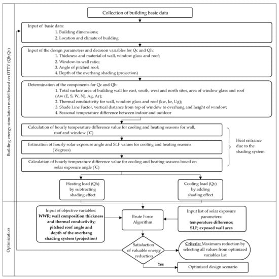 Flowchart of the BESM and optimization. Note: is a heat gain through the envelope for the cooling season; is a heat loss through the envelope for the heating season; Aw, Ag, and Ar are the surface area of the wall, window, and roof; kw is the overall thermal conductivity of the wall; kr is the thermal conductivity value of the roof; and Ug is the U-value of glazing.