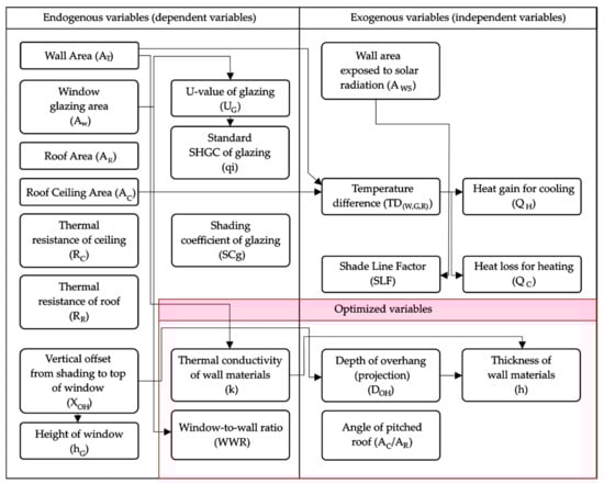 In this research, the main variables used for OTTV determination are divided into two categories: endogenous and exogenous. Endogenous variables describe the particular effect on the model that is dependent on a variety of factors on the model [26]. These variables are the wall area, window glazing area, roof area, roof ceiling area, thermal resistance of ceiling, thermal resistance of the roof, vertical offset from shading to top of the window, height of the window, U-value of glazing, standard solar heat gain coefficient of glazing (SHGC), thermal conductivity, and window-to-wall ratio (WWR). Exogenous variables, in turn, are variables whose origin is outside of the model and whose purpose is to explain other variables or outcomes [27]. The temperature difference between the indoor set point and outdoor dry-bulb temperature, area of the wall exposed by solar radiation at specific times, shade line factor values based on the angle of solar radiation, heating and cooling loads, thickness of wall materials, angle of pitched roof, and depth of overhang shading (projection) are considered as exogenous variables in this research. The detailed chart regarding the connection between endogenous and exogenous variables and their consistency is shown in Figure 2.