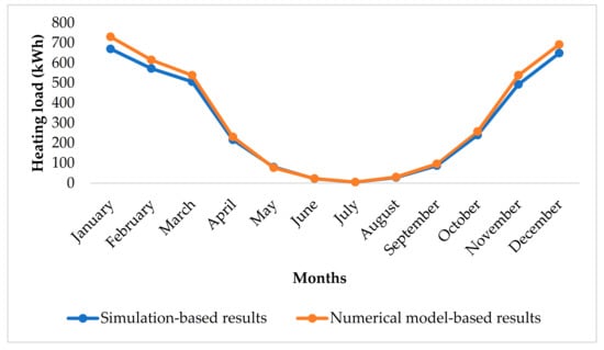 The results of the numerical model and simulation are shown in Figure 6. According to the results, the maximum percentage difference between the numerical model and simulation-based results did not exceed 7.7%. Thus, it can be concluded that numerical model-based results with materials’ thermal characteristics can be used and optimized for energy load performance.