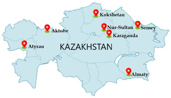 Kazakhstan’s existing residential building stock comprises around 347.4 million square meters, almost the one third of which are outdated inefficient buildings that were constructed during the Soviet era [3]. In the 1960s, large-panel residential building projects for seismically active locations were planned and realized, while in the 1970s, the high-rise building development (from 9 to 12 stories) began. During this time, standard projects were developed that established a qualitatively new approach to standard design and expanded throughout Kazakhstan’s cities [4]. The majority of the current housing stock is made up of multifamily structures that are connected to district heating via boiler houses or cogeneration stations, the rest is accounted for in unfamiliar and semi-detached houses [5,6].