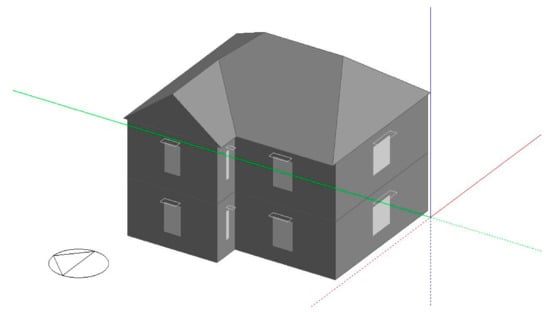 For this research, a townhouse was analyzed (Figure 8) in seven different cities (Nur-Sultan, Almaty, Karaganda, Aktobe, Atyrau, Semey, and Kokshetau) of Kazakhstan. This building was analyzed by facing the west direction with the front side. The dimensions of the building are 13.6 m × 12.4 m, with an elevation of 3 m for each story and 308.48 m2 of living area. The overhang was installed as the main shading system with a depth (projection) of 0.5 m. The initial angle of the pitched roof was kept as 27°. The WWR was kept at 5% and the height of the windows was 1.5 m. Table 4 represents the thermophysical properties of the building envelope materials. This building was used as a base model for the energy analysis in all of the selected cities.