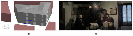 Studied building in Campo de Criptana (Ciudad Real, Spain): (a) North-facing façade in DesignBuilder, indicating the location of the monitored room (b) Panoramic view of the room.