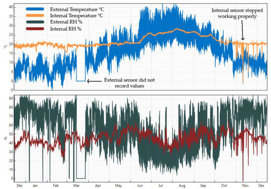The monitoring system is the same that was used in [17]. The sensor is a SHT75 (Sensirion AG, Stäfa, Switzerland), with accuracy ±0.3 °C and ±1.8%, while external conditions like temperature, relative humidity, and wind speed and direction were measured using a weather station, model FSW 20 (PCE Ibérica S.L., Tobarra, Spain) located in the same village. The period of monitoring is from 14 December 2017–15 December 2018 (Figure 3).