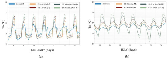 Figure 4a,b shows the Indoor Air Temperature (Tia, in °C) of one week in Winter (8–14 January 2018) and one week in Summer (25–31 July 2018), in the studied room. Both figures show the effect of considering thermal mass, and it is more evident in the summer period, when temperatures in S1 and S2 are much more stable than those in S3 and S4. Also, both graphs show that the temperature in S1 is closer to the measured values.