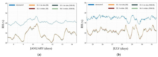 Relative Humidity (RH, %). Measured values vs. simulations: (a) 8–14 January 2018 (b) 25–31 July 2018.