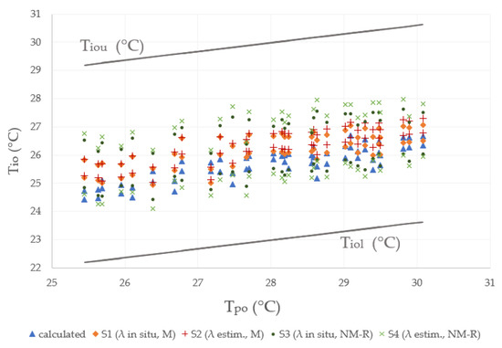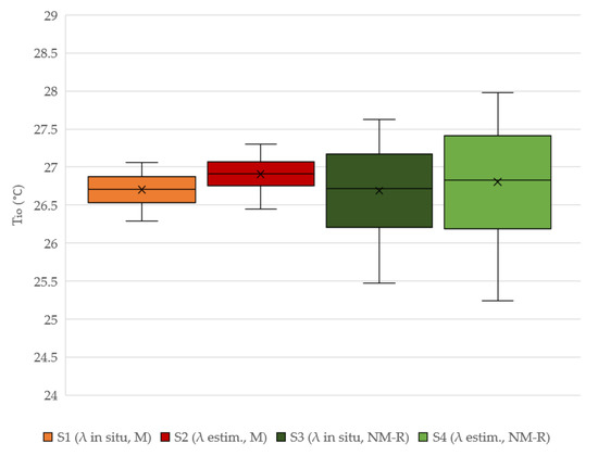 For the summer period, Tiou and Tiol were already analysed in Figure 6, and we can see that all four simulations S1 to S4 and calculated values would comply with the ASHRAE 55. Figure 8 shows the boxplot for the one-week summer period (25–31 July), and as it happened in the winter period, we can also distinguish more thermal stability in S1, which would lead to a higher thermal comfort: there is a 0.77 °C difference between the maximum and minimum temperature, while this difference in S2 is 0.85 °C, in S3 is 2.15 °C, and in S4 is 2.74 °C.