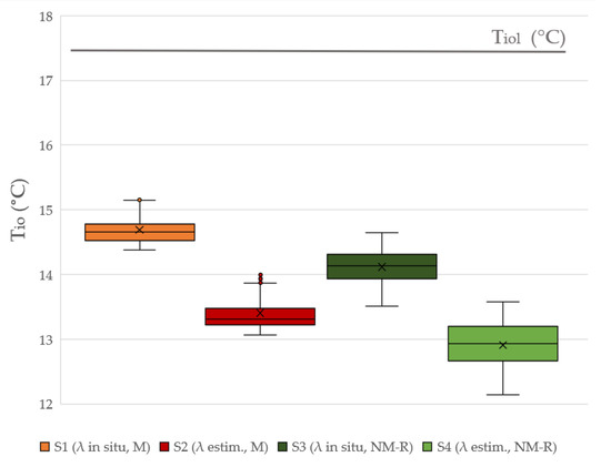 During the winter period, as the prevailing outdoor temperature (Tpo, calculated with Equation (4)) is always 10 °C, the minimum comfort operative temperature is Tiol = 17.4 °C (Equation (3)), and a line has been added to represent it. Here, although none of the simulations would show a compliance with the ASHRAE standard, we can distinguish that the results of S1 are closer to achieve it: the median, the mean and the minimum are the highest values of the four simulations. The difference between the minimum value and the Tiol is 3.02 °C, a difference of 0.87 °C with that obtained with S3 existing, more than 1.3 °C with S2 and more than 2.2 °C with S4. Also, there is more thermal stability in S1: 0.78 °C between the maximum and minimum temperature, while S2 is 0.96 °C, S3 is 1.13 °C and S4 is 1.41 °C. All this is detailed in Table 9 highlighting in bold values that would be closer to complying with ASHRAE 55.