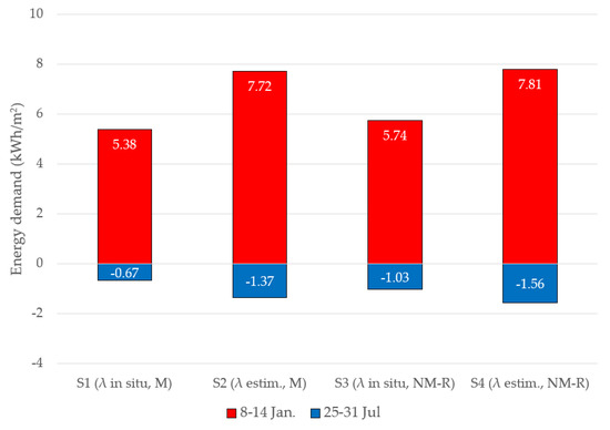 Figure 9 shows the energy demand of the studied room, obtained with DesignBuilder (called “Zone Sensible Heating/Cooling (kWh)” in this program), during the described periods of time described before (8–14 January and 25–31 July). Therefore, it gives us the idea of how much energy—in kWh/m2—requires the room to maintain the conditions described in Section 2.2.4 to achieve comfort during those periods of time. It is important to remember that heating and cooling systems use a time schedule “always on”.