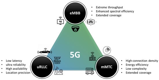 Another factor that makes the IoT a welcome solution for building fire evacuation control is the incentive of the fifth generation of cellular technology (5G). 5G is a new global wireless standard after 1G, 2G, 3G, and 4G networks []. It was proposed and started its commercial deployment in 2019 []. Compared to the previous 2G, 3G, and 4G Long Term Evolution (LTE), 5G operates in an additional millimeter-wave (mmWave) spectrum from 28 GHz up to 95 GHz to provide a larger band of frequencies []. As a result, it enables a peak throughput of 10–20 Gbps, 100 times faster than 4G LTE networks. More than increasing the speed, 5G also contains technologies enabling approximately 1 ms latency in data delivery, increased energy efficiency consumption, massive device communication, etc. []. These attributes make new experiences and services in IoT connectivity and applications possible []. Three new service areas were categorized, which are enhance mobile broadband (eMBB), massive machine type communication (mMTC), and ultra-reliable and low latency communication (uRLLC). The overall vision for these three broad 5G usage families and their basic service requirements are illustrated in Figure 1.