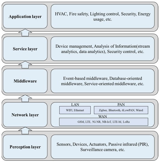 The IoT system is an integration of technologies to provide end-to-end IoT solutions with a mix of IoT devices, IoT data, IoT platforms, and IoT applications []. Therefore, the design of its system architecture is the core that enables the function of an IoT system. Generally, the architecture of IoT systems can be divided into layers. An intelligent IoT system can be represented as a 5-layered architecture, which contains (1) perception layer, (2) network layer, (3) middleware, (4) service layer, and (5) application layer []. Figure 2 illustrates the schematic diagram of such an IoT architecture for smart buildings.