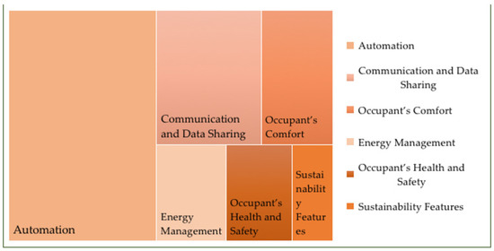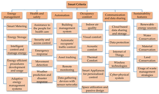 According to Figure 5, the most influential criteria in determining smartness is automation followed by communication and data sharing, occupants’ comfort, energy management, occupants’ health and safety, and sustainability features. The composition of sub-criteria under respective major criteria is illustrated in Figure 6.