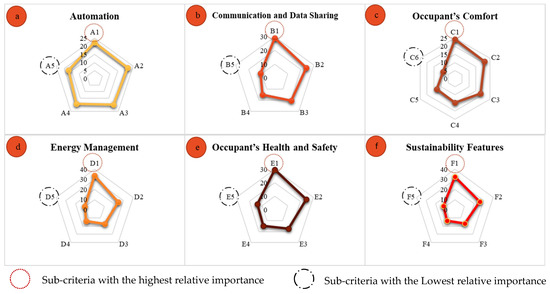 Composition of subcriteria related to smart building: (a) subcriteria related to automation; (b) subcriteria related to communication and data sharing; (c) subcriteria related to occupants’ comfort; (d) subcriteria related to energy management; (e) subcriteria related to occupants’ health and safety; and (f) subcriteria related to sustainability features.
