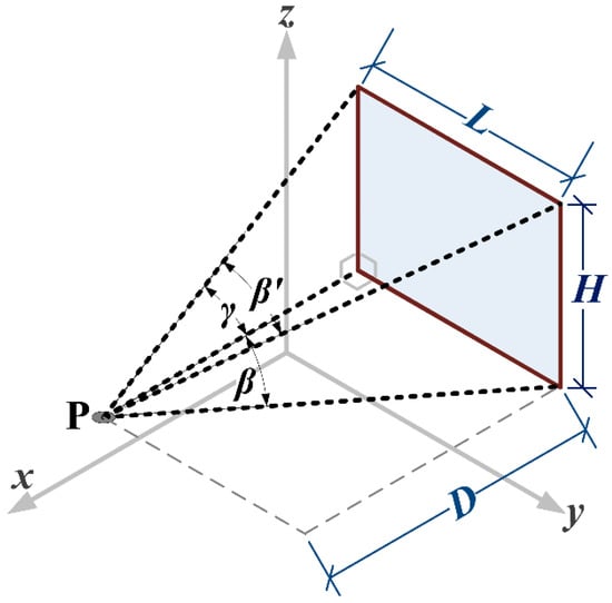 Consider now a black room with a vertical, rectangular daylight opening with length L and height H on one of the room walls (Figure 1), under the CIE standard overcast sky. Suppose inside the room there is a calculation point P on the horizontal (work) plane, at a distance D from the opening wall. The projection of P on the y–z plane, where the opening sits, coincides with one of the vertices of the opening, which in this case is the lower-left vertex (Figure 1).
