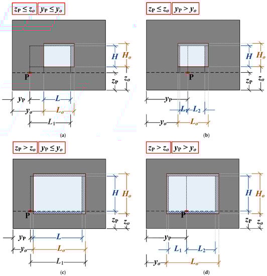 The effective daylight opening in all configurations has the length L and height H, both of which are, respectively, smaller than Lo and Ho. In Figure 3, the effective daylight opening is shown by the unshaded areas. Notice that, despite the actual opening being symmetrically placed at the façade, the effective opening is, in general, not centred, unless P lies on the room’s longitudinal axis (i.e., yP = Wr/2).