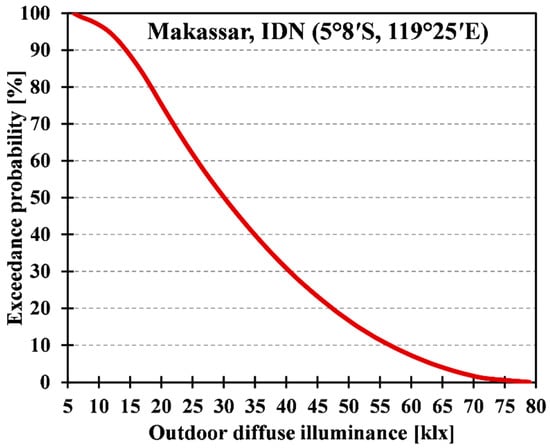 Annual exceedance probability of outdoor daylight diffuse illuminance at 09.00–17.00 h in the city of Makassar, Indonesia; adapted from [].