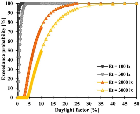 In this study, however, it is proposed to observe the typical annual profile of outdoor diffuse daylight illuminance (Eout) in the building site location. Such profiles may be available in national standards (e.g., the former BS 8206-2:2008 []) and are practical for climates with pre-dominantly overcast sky [,,]. By observing the profile, one can obtain the probability of any specified Eout values being exceeded in a typical year under the overcast sky model. The annual exceedance probability Pex can be described as a function of Eout, i.e., Pex = F(Eout). However, Eout and the total indoor illuminance at any calculation point P (i.e., Ein,P) are proportional by the factor of DFP. Therefore, given a certain Ein target value and having known the DF value at P, the annual probability of exceeding Ein is equal to the annual probability of exceeding the corresponding Eout. One can thus write: