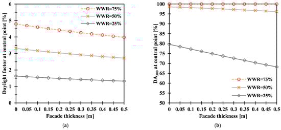 The assumption of the worst-case scenario, i.e., under the standard CIE overcast sky, throughout this study is not a misleading attempt because the necessary conditions are all given in the first place. The results are also in agreement with the reference that employed annual simulation with weather data of similar locations in the tropics. Moreover, as mentioned in Section 3.1, there are 35 calculation points equally spaced on the workplane, and calculations are performed for all those points, not only on a single point. For simplicity, only metrics at the central calculation point and spatial metrics for the entire room are reported in Section 4. However, to obtain the spatial metrics, one obviously first needs to calculate the metric values at each calculation point; thus, no points are deliberately isolated. The plot across the façade thickness, if found linear, as in the case for the DF at the central point, suggests that the findings are consistent.