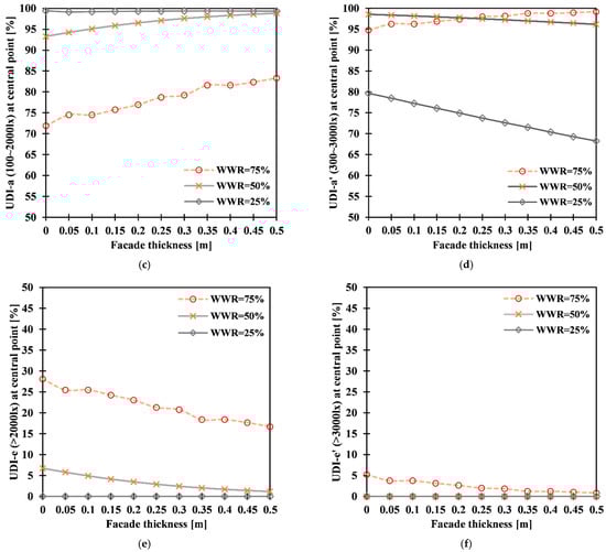 Meanwhile, the unique pattern of UDI-a at the central point (Figure 7c), which has different directions (negative or positive) and gradients at different WWR, can only be observed when scenarios with large WWR values are considered. This was not performed in the earlier study; thus, a new insight is offered on this matter. From the sensitivity analysis results, it can be said that the trends for spatial metrics for the entire room are not necessarily similar to those at the central point. Different results can be expected if the single calculation point is located, for instance, at 1/4 or 3/4 of the room depth [], or 1/3 of the room depth [], or at the distance of 2 or 2.5 times the window-head height as per the well-known rule of thumb [,].