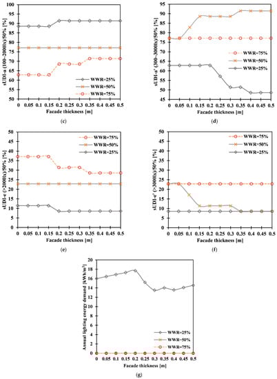A few remarks can be made regarding the presented results of this study. The results are bounded with the assumed room geometry and site location, even though the concept can still be applied in any location, provided the annual profile of outdoor diffuse daylight illuminance. In the reference [], the WWR of the façade was set constant at 25%, following the generally recommended or optimum WWR values in the literature [,,,], between 20% and 30%. While assuming a value within that specific range may be reasonable, the observed effect of a façade thickness cannot be generalised, particularly for scenarios with a larger opening area. In the current study, situations with a larger WWR are also considered to provide more insights on the matter. Due to the use of the standard CIE overcast sky, however, the effect of building orientation is irrelevant in this study, as opposed to the earlier one that assumed the Perez sky model.