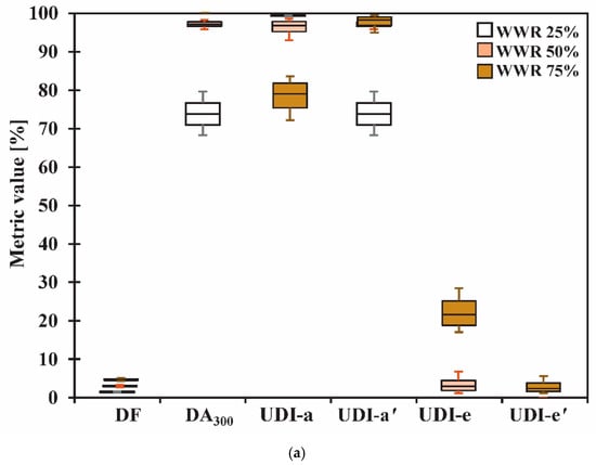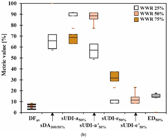 Some of the remaining metrics are found to have a zero IQR, meaning that the values are not changed at all in scenes with a small opening area; but the IQR becomes rather large in scenes with a large opening area. Examples of these metrics are UDI-e and UDI-e′ because they are sensitive to the upper illuminance threshold (2000 or 3000 lx), which is more likely to be achieved when the WWR is large. Conversely, several other metrics have a zero IQR in scenes with a large opening area but have a large IQR in scenes with a small opening area. The DA300, sDA300/50% and ED50% are examples of this type of metric, because they are sensitive to the lower illuminance threshold (300 lx), which is critical when the WWR is small.