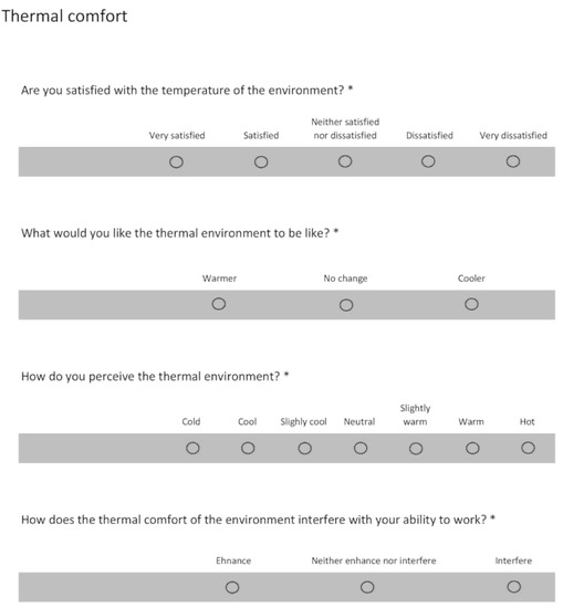 Figure 2. Satisfaction, preference, perception and interference scales related to Thermal Comfort. The “*” identify mandatory questions. - Section F refers to overall satisfaction and satisfaction in relation to some other aspects that may affect working activities: Available space, furniture and accessories, visual and acoustic privacy, productivity. Participants have to answer questions about the relative importance of ten specific aspects in relation to satisfaction and how WFH could affect the comfort perception. Table 3 summarises the characteristics of the scales used to identify the satisfaction, preference and perception of participants in relation to the considered aspects and the relative scores. Depending on the scale used (one polar or bipolar), the value zero is not always associated with a “neutral” score. With bipolar scales, the neutral value zero is the best condition. However, with AQ preference, AQ perception and IAQ perception characterised by one polar scale, the value zero is associated with the best condition;