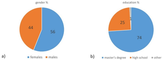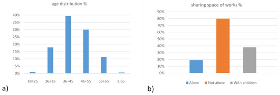 The sample of participants consists of 56% females and 44% males (Figure 4a), aged between 26 and 65 years. The breakdown by age group (Figure 5a) is as follows: 39% of participants are in the age range 36–45, 30% in the range 46–55, 19% in the range 26–35 and 12% in the range 56–65. More than 40% are public sector employees (including researchers and administrative staff), about 30% are private sector employees, 14% are university researchers or professors and 12% are freelancers, generally with a high level of education: 74% report having a master’s degree and 25% have a high school diploma. When the participants submitted the questionnaire, 75% of them had been WFH for more than 1 month and 22% for more than 2 weeks. Thus, the majority of participants were accustomed to WFH. The survey shows that only 19% of the participants perform their work activities alone, and more than 80% share the spaces with other family members. About 38% share their working life with one or more children (Figure 5b).