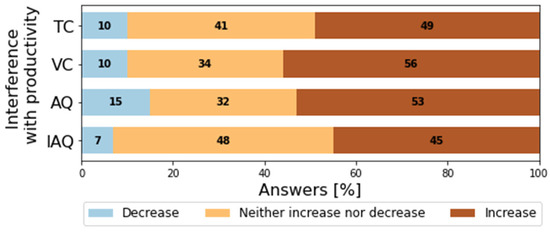 Furthermore, the survey investigates how home workers feel about their productivity in relation to the indoor environmental conditions during the lockdown (Figure 7). In general, the distribution of responses shows that participants feel that all indoor conditions (TC, VC, AQ, IAQ) increase their productivity. More than 50% of the participants answer that VC and AQ increase their work productivity. Furthermore, 49% and 45% believe that TC and IAQ improve their work productivity.