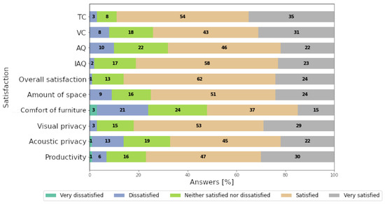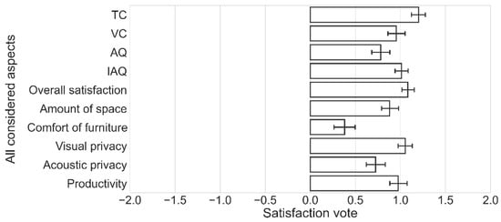 To answer these two questions, satisfaction, preference, perception and interference of environmental factors in relation to worker productivity were analysed. Satisfaction was evaluated for all considered aspects. For perception and interference, only environmental factors (TC, VC, AQ and IAQ) were considered. For preference, TC, VC and AQ were evaluated. Both TC and VC use a bipolar scale for perception, meaning that the central value (Neutral = 0) is the best perception. It was found that 63% and 78% of the responses on thermal and visual comfort expressed a Neutral perception (mean values of about 0.0 and −0.2, respectively). Furthermore, for a one polar scale, the best perception, which (once) again corresponds to the 0 value, is the least disturbance, i.e., “not smelly” for IAQ and “very quiet” for AQ. The majority of participants, about 74% of the participants, do not perceive any smells, and the mean perception for IAQ is 0.3, between “not smelly” and “slightly smelly”, which means that workers΄ perception for IAQ is also very good. In contrast, responses for AQ are spread across the range, with AQ achieving a mean score of 1.41, ranging between ”Quiet” and “Slightly noisy”, with 38% of participants rating the acoustic quality of the environment as “Quiet” and 31% as “Slightly noisy”. Figure 6 summarises the results for each of the environmental factors considered.