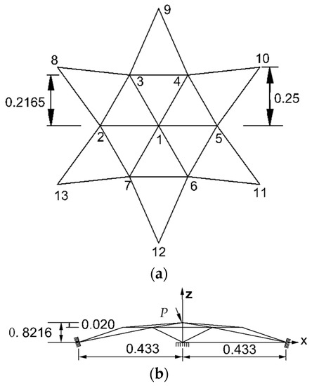 The geometric parameters of the hexagonal flat reticulated shell structure are shown in Figure 1 [23]. The material is assumed to be an ideal elastic material (isotropic), the elastic modulus is E = 3030 MPa, the shear modulus is 1096 MPa, the Poisson’s ratio is 0.3, and the mass density is 7850 kg/m3. The component adopts a rectangular solid rod with a cross-sectional area of 317 mm2. The load P acts downward at vertex 1.