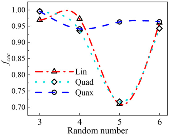 Figure 2 shows the effective accuracy fcec of the new method with three fitting functions. In the three cases, they all consider different numbers of random variables. When using the Lin polynomial, the curve of the number of random variables–calculation accuracy is a sine curve of one wavelength, and one of the peaks is very large. When using the Quad polynomial, the fluctuation phenomenon of the curve is similar to the Lin method, and the two curves are very close. When using Quax polynomial, the curve has no significant fluctuations, and the trend is stable. Therefore, given the effective accuracy f and stability, this method’s response surface fitting function is preferably Quax polynomial.