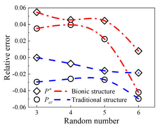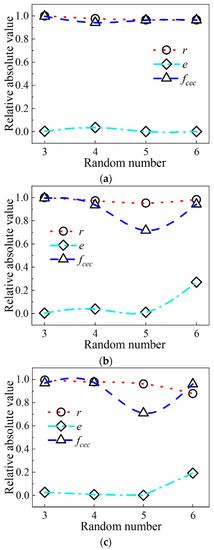 Figure 3a–c further shows the detailed error and precision values of e, r and fcec when the method uses three polynomial fittings. Figure 3a shows that the e/r-random variable curves calculated by this method using Quax polynomials are all stable. At the same time, it shows that the critical load accuracy e calculated by it is less than 3.70%, which meets the engineering accuracy. At the same time, Figure 3b,c shows e, r, and f values when adopting the Quad and Lin polynomials in this method, respectively. The stability of their e/r//f-random variable number curve is worse than the result of the Quax polynomial, and the value of e is larger than the result of the Quax polynomial, 27.09% and 19.18%, respectively, exceeding the usual engineering accuracy of 5%. Therefore, from the various detailed accuracy (error) analyses shown in Figure 3 above, it can be seen that the Quax polynomial is also the preferred response surface fitting function of this method.