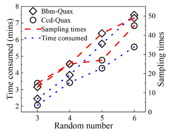 The time consumed and sampling times when using Box and CCD matching points (with the same fitting function Quax).