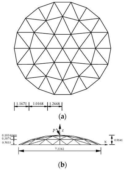The K6 reticulated shell structure [17] has a span of 7.3342 m and a vector height of 0.9141 m. Figure 6 shows the specific geometric dimensions. The rod adopts a hollow round tube, the cross-sectional area of the tube is 55.25 mm2, the steel density is 7850 kN/m2, and the material’s elastic modulus is E = 3030 MPa, the shear modulus is 1.096 × 103 MPa, and the Poisson coefficient is 0.3.