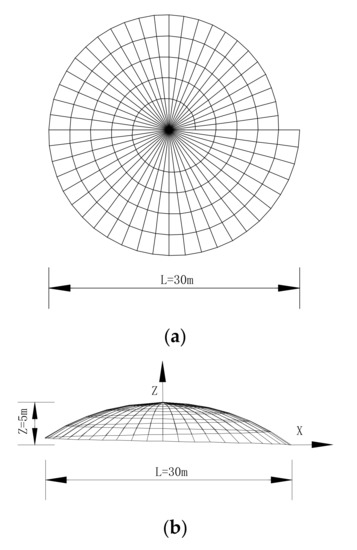 Numerical model of K6 reticulated shell structure. (a) The plan view of the structural model (m). (b) The elevation view of the structural model (m).