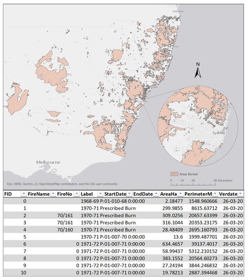 The primary data source that stands at the base of this research is a polygon shapefile that was published by the NSW State Government and the NSW Department of Planning, Industry and Environment (2010) [43], publicly available under a Creative Commons public license. The dataset visualises the final fire boundaries for every fire in NSW since 1900 in a vector format. Each of the polygon’s attributes are described in an attribute table that contains information about each fire’s date, season, type, area and perimeter (Figure 2).