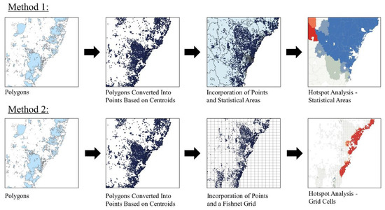 The spatial framework of this study (Figure 7) was developed according to the elements of previous hotspot analyses in the literature [40,51,52]. However, as opposed to past studies, this study’s framework was developed to specifically address the authors’ intention to answer the specific research questions of this study. As opposed to the common practice in the literature to convert polygons into points, and then aggregate them into either a hexagonal or fishnet grid [33,55,56], this study’s spatial framework has aggregated bushfire centroids to level 2 statistical areas in order to be able to associate bushfire patterns to municipal jurisdictions, rather than geographical grid cells.