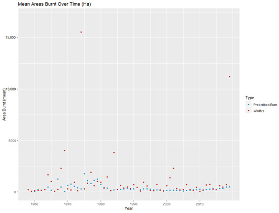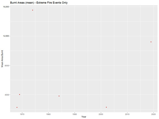 In the U.S., extreme fire events, or megafires, are defined as bushfires with a minimum area of 40,500 hectares; while in Europe, the size is smaller, with a minimum of 1000 ha [64]. Using any of these definitions to identify extreme fire events in NSW is not applicable to this study’s data, since the median area of fires in this dataset is already much higher than the U.S. definition. Consequently, extreme events were identified by detecting statistical outliers [10], based on a classical boxplot. These values were then extracted into an additional data frame to determine if there was also an increasing trend in extreme fire events alone. The results (Table 1) suggested years when extreme fire events occurred with a mean burnt area larger the 1887 ha. Figure 9 was produced using only the values in Table 1, in order to examine if there was a pattern of change in the burnt area of extreme fire events over time. Figure 9 does not indicate a pattern of increase or decrease in the area burnt in extreme fire events; however, the results (Table 1, Figure 9) suggest that extreme fire events occur in cycles in New South Wales, similar to the fire pattern described by Cheney [5] and Payne [1].