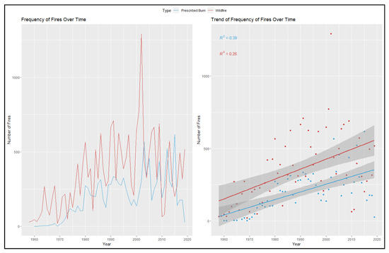 Regarding the frequency of fires, Figure 10 was produced to examine if the frequency of fires is increasing over time. The results indicated that the frequency has been steadily increasing over time since the 1960s. However, when examining the figure, it appears that there is much more variability in the data between 1980–2020 compared to 1960–1980.