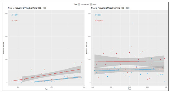 Figure 11 was created to examine if the trend was more significant between 1960–1980 compared to 1980–2020. The results show an increasing trend of the frequency of fires between 1960–1980; however, this could be a result of less available data between those years. In both Figure 10 and Figure 11, the variability in the results was higher among bushfires (wildfires) compared to prescribed burns. A possible reason for these results could be the origin of the fires. Compared to prescribed burns, which are man-made fires that are scheduled by fire agencies in different intervals, bushfires depend on different weather conditions such as wind and rain. Changes in these factors are likely to increase the randomness in the frequency of fires in each bushfire season.