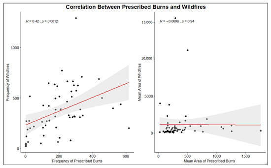 Another aim of this study was to examine whether prescribed burning is an effective tool to reduce bushfire risk. To do so, a bivariate Pearson’s correlation test was performed according to each fire’s type (prescribed burn/bushfire) (Figure 12), to measure the strength of the linear relationship between two variables [46]. The hypothesis behind using a correlation test was that if prescribed burning reduces bushfire risk, then the results should indicate a negative correlation between bushfires and prescribed burns in both frequency or burnt area. The principal of using a correlation test to examine the relationship between bushfires and prescribed burns originated from Pollet [45], who also used a correlation test to assess the effectiveness of prescribed burns; however, in that study, they analysed the correlation between pine tree characteristics and fire severity, while our study analysed the direct relationship between bushfire size and frequency to prescribed burns. Therefore, the results of Pollet [45] and Omi (2002) cannot be compared with this study.