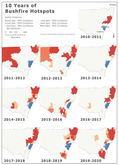 Figure 14 was produced to visualise the changes in the bushfire frequency hotspots in the 10 years preceding the catastrophic 2019–2020 bushfire season. Figure 14 shows how versatile bushfire location can be, and demonstrates how hotspots changed between 2010–2020. As in Figure 13, blue areas indicate bushfire coldspots, while red areas indicate hotspots. The figure reveals that, similar to Figure 13, the area around Greater Sydney, including Wollongong and the Central Coast, has been a bushfire coldspot in every one of the bushfire seasons between 2010–2020, while the location of bushfire hotspots seems to be changing more radically. Even though bushfire hotspots changed more radically than coldspots throughout this time period, the bottom half of Figure 14 could suggest a pattern of movement in bushfire hotspots between 2015–2020. During those years, hotspots seemed to move closer to the area of Greater Sydney, Australia’s most populated area.
