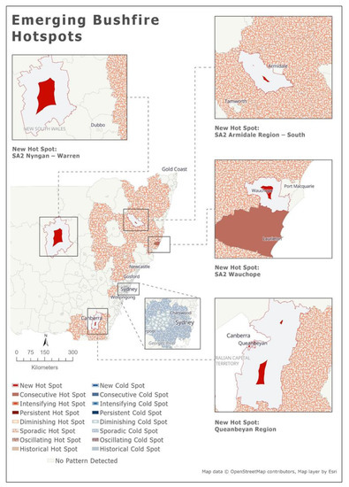 Finally, the study examined if the frequency of bushfires was spatially clustered over time, and if so, how the clustering was different compared to the 2019–2020 bushfire season. Using different hotspot-analysis methodologies, the study found four new statistical areas that became hotspots of bushfire frequency during the 2019–2020 bushfire season; namely, Nyngan—Warren, Queanbeyan Region, Armidale Region—South and Wauchope. In addition, the findings of this study also suggest that there is a possible pattern of movement in bushfire frequency hotspots towards the highly populated area of Greater Sydney. Since this pattern of movement is not absolute, and due to the potential threat of bushfires moving towards dense urban areas in the future, the authors strongly recommend future research in that field.