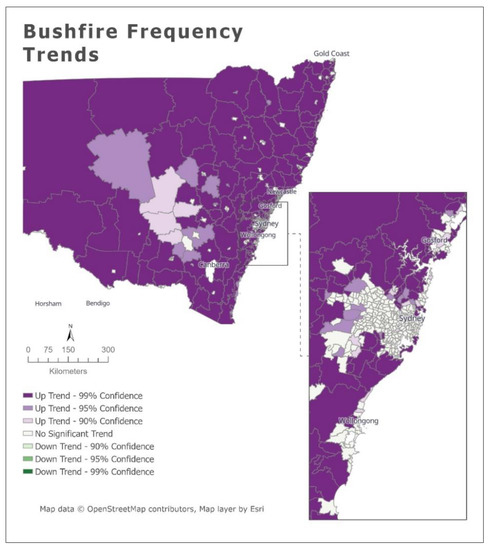 As shown in Figure 17, there was a trend of increase in the frequency of fires, with a 99% confidence, in most of the level 2 statistical areas in NSW, except in metropolitan areas such as Sydney. This reinforces the hypothesis suggested by the literature that bushfires are increasing in NSW, as well as overall in Australia. It is important to note that numerous studies point out that the increase in bushfire frequency is a direct result of climate change [6,9,10], but it was not within the scope of this research to assess what the cause of this increase, and the authors recommend this topic as a future direction for this research.
