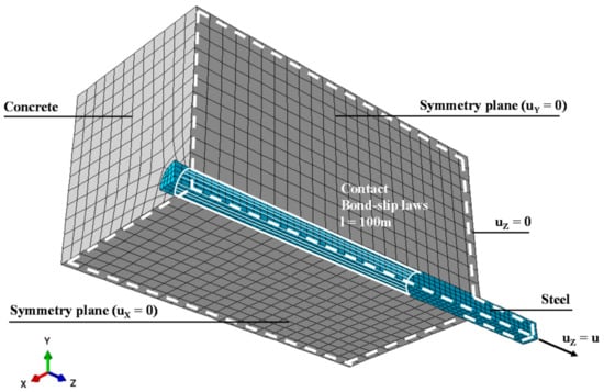 - The use of FIB Model Code equations for unconfined concrete and good bond conditions are found to provide good estimates of bond strength for concrete with RA from CDW. When the full set of equations prescribed in this standard is used, in the finite element model developed, the bond-slip behavior (bond stress vs. slip curves) between steel and concrete with RA from CDW can also be accurately predicted: the average ratio between numerical and experimental bond strengths is 0.97. Given this and since the results presented are only dependent on the compressive strength of concrete and on size and content of RA from CDW, it can be stated that the outcomes presented have general validity and may be used as a benchmark in future investigations.
