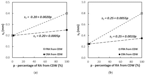 - The high roughness and clay content of RA from CDW leads to a need to increase the effective water/binder ratio to obtain the workability constant in all concrete mixes (fixed parameter). This, together with the high porosity of RA, leads to recycled aggregate concrete with lower strength and stiffness by circa 5% and 4%, respectively, compared to the reference concrete per each 10% increase of NA replaced with RA from CDW.