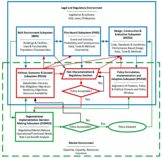 The sociotechnical building regulatory system (STBRS) framework proposed by Meacham and van Straalen [15] provides one model of the building regulatory system framework. This framework contains two operational environments, “legal and regulatory” and “market”. There is also an “interactions” environment representing the space for decision-making. In the overall STBRS framework, there are subsystems related to technology (Built Environment (BESS), Fire Hazard (FHSS) and Design, Construction and Evaluation (DCESS)), with policy/decision-making (Political, Economic, and Societal (PESSS) and Policy Formulation, Implementation, and Adoption (PFIASS)). They are also subsystems associated with the market (Organizational Implementation Decision-Making (OIDMSS)).