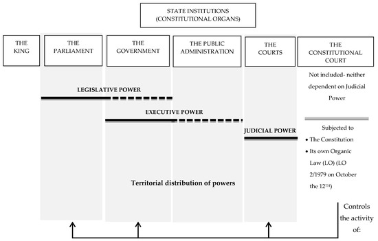 Spain is a social and democratic constitutional state. The form of government is a parliamentary monarchy. Sovereignty rests upon the nation, which elects its representatives to a bicameral parliament [43]. The Constitution was approved by national referendum and sanctioned by the King on 27 December 1978. The form of government, the territorial structure of the State, and the powers of the Head of State and the Executive in respect of Parliament were determined by the Constitution at that time. The definition of the fundamental rights and freedoms of citizens and the establishment of a system of guarantees for their protection were also established at this time.